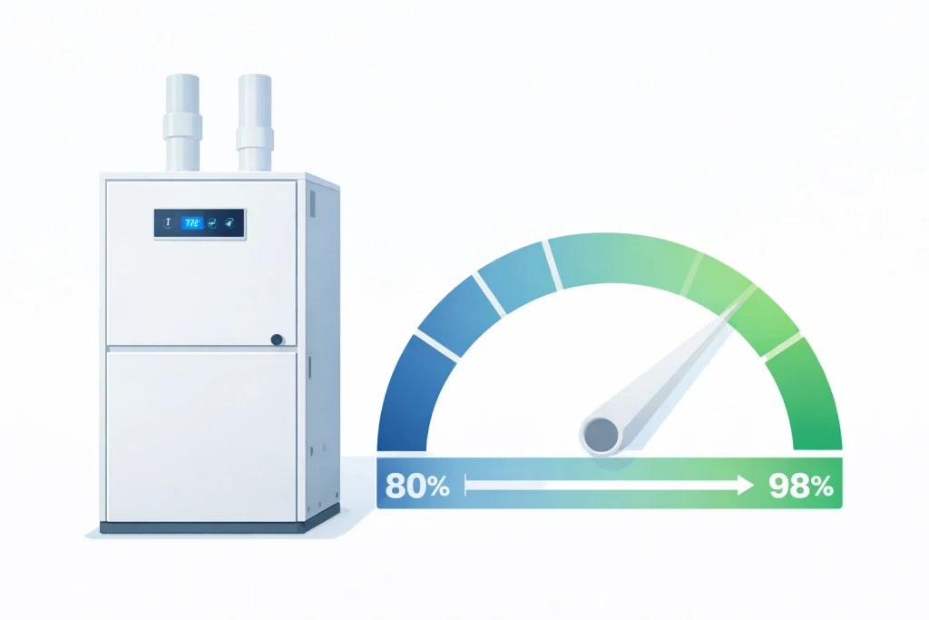 AFUE (Annual Fuel Utilization Efficiency) measures how efficiently a furnace converts gas to usable heat. An 80% AFUE furnace wastes 20 cents of every dollar spent on fuel. A 96% AFUE furnace wastes only 4 cents.