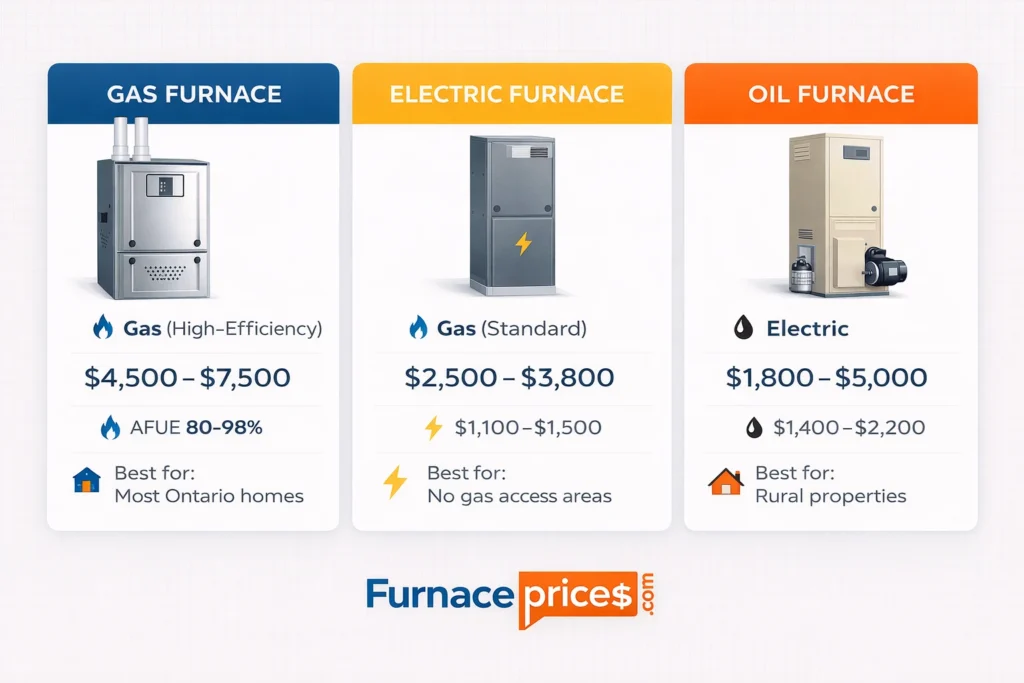 Gas furnaces typically offer the best balance of upfront cost and operating efficiency in Ontario. Electric furnaces have lower installation costs but higher monthly bills. Oil furnaces are costly to run and maintain.